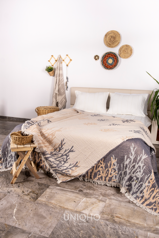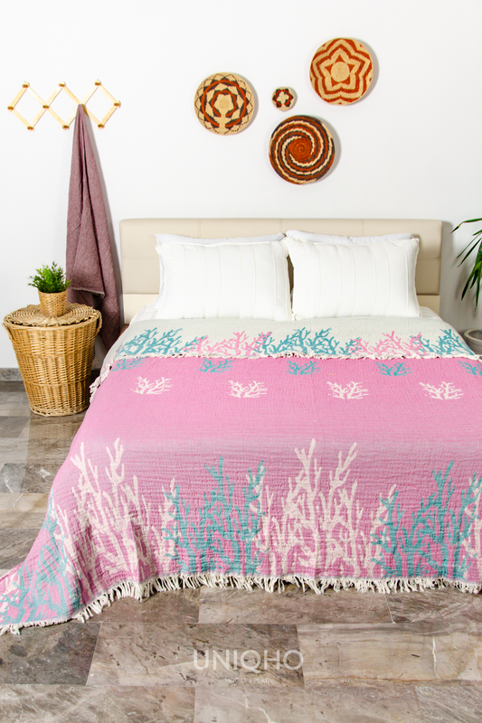 Colcha, Edredón, Impresión con Bloques Madera, Coral, Azul