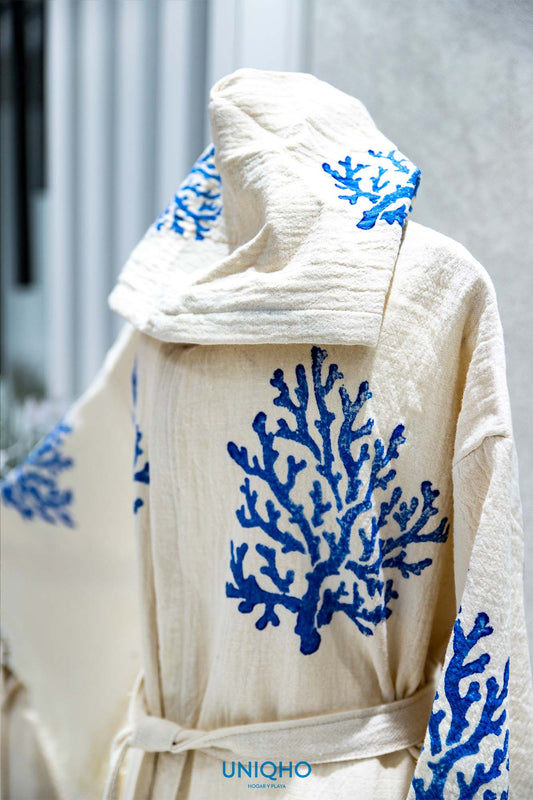Kimono, Albornoz, Impresión con Bloques Madera, Coral, Azul