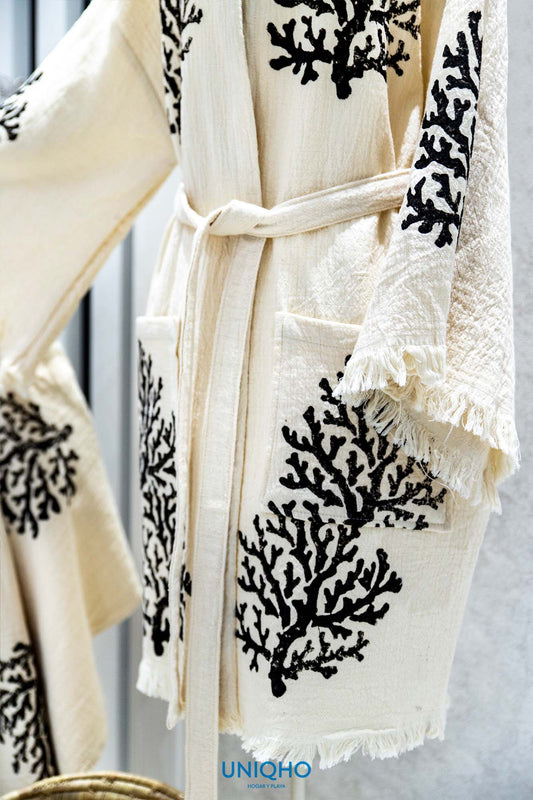 Kimono, Albornoz, Impresión con Bloques Madera, Coral, Negro