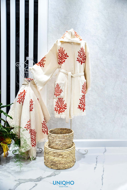 Kimono, Albornoz, Impresión con Bloques Madera, Coral, Rojo