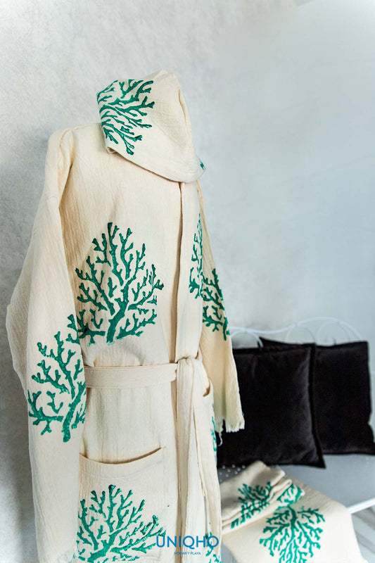 Kimono, Albornoz, Impresión con Bloques Madera, Coral, Verde